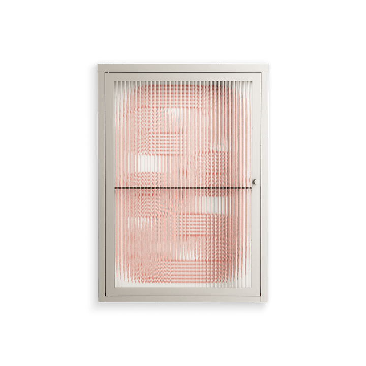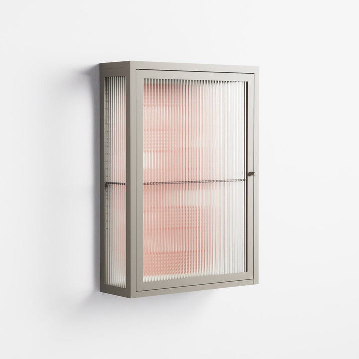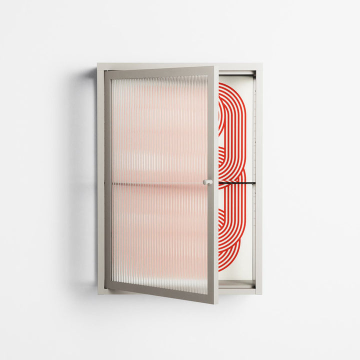 United by Vratislav Pecka, displayed within the Vitrine Wall Cabinet behind Reeded glass. Finished in the colour Pebble, the cabinet becomes a frame for the artwork and the objects within.
