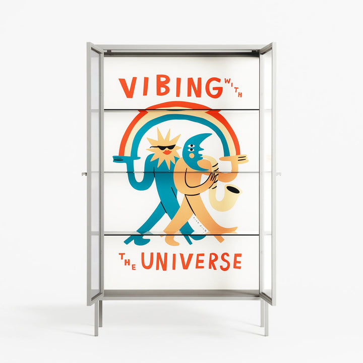 Vibing With The Universe by Aley Wild, displayed within the Vitrine Cabinet behind Reeded glass. Finished in the colour Chalk, the cabinet becomes a frame for the artwork and the objects within.