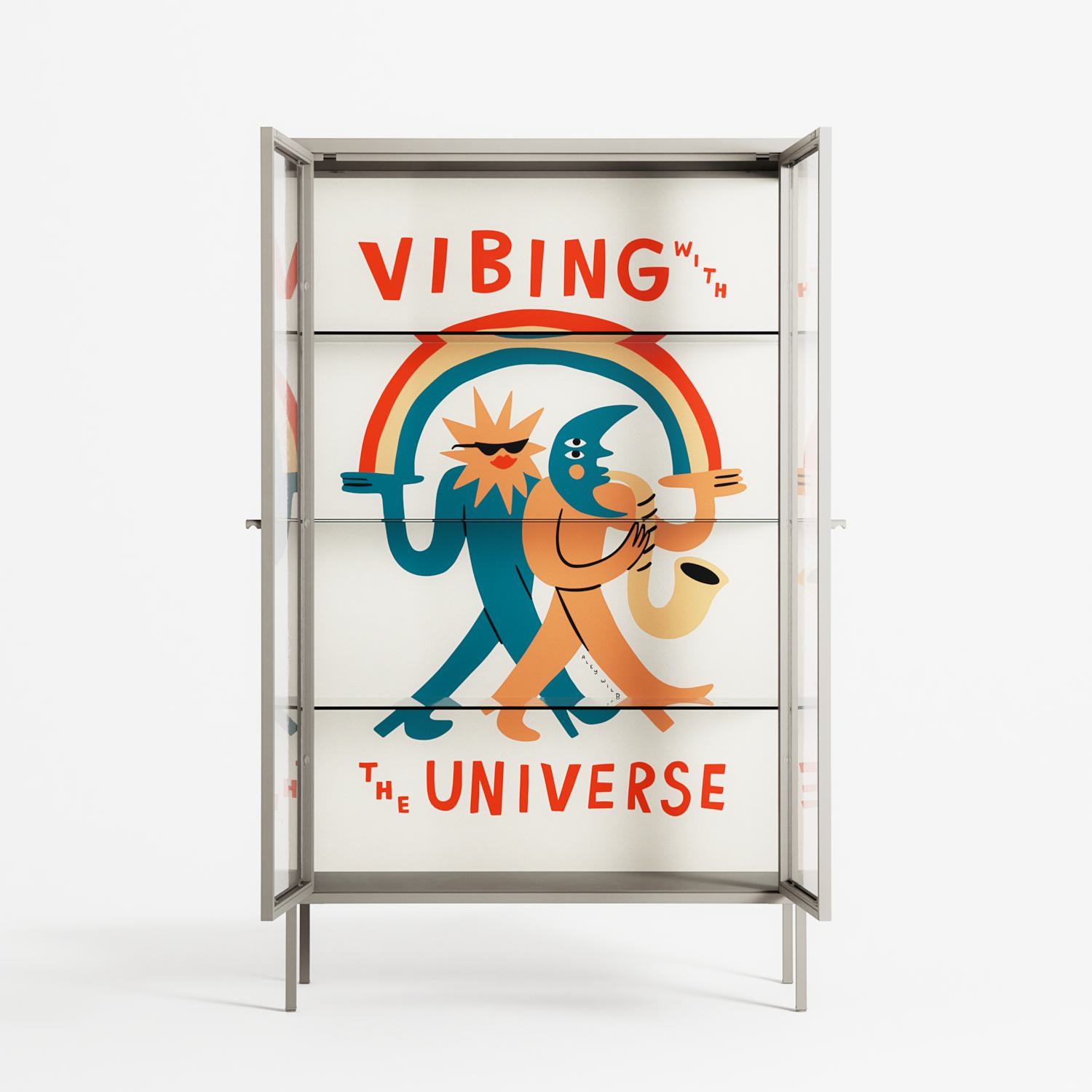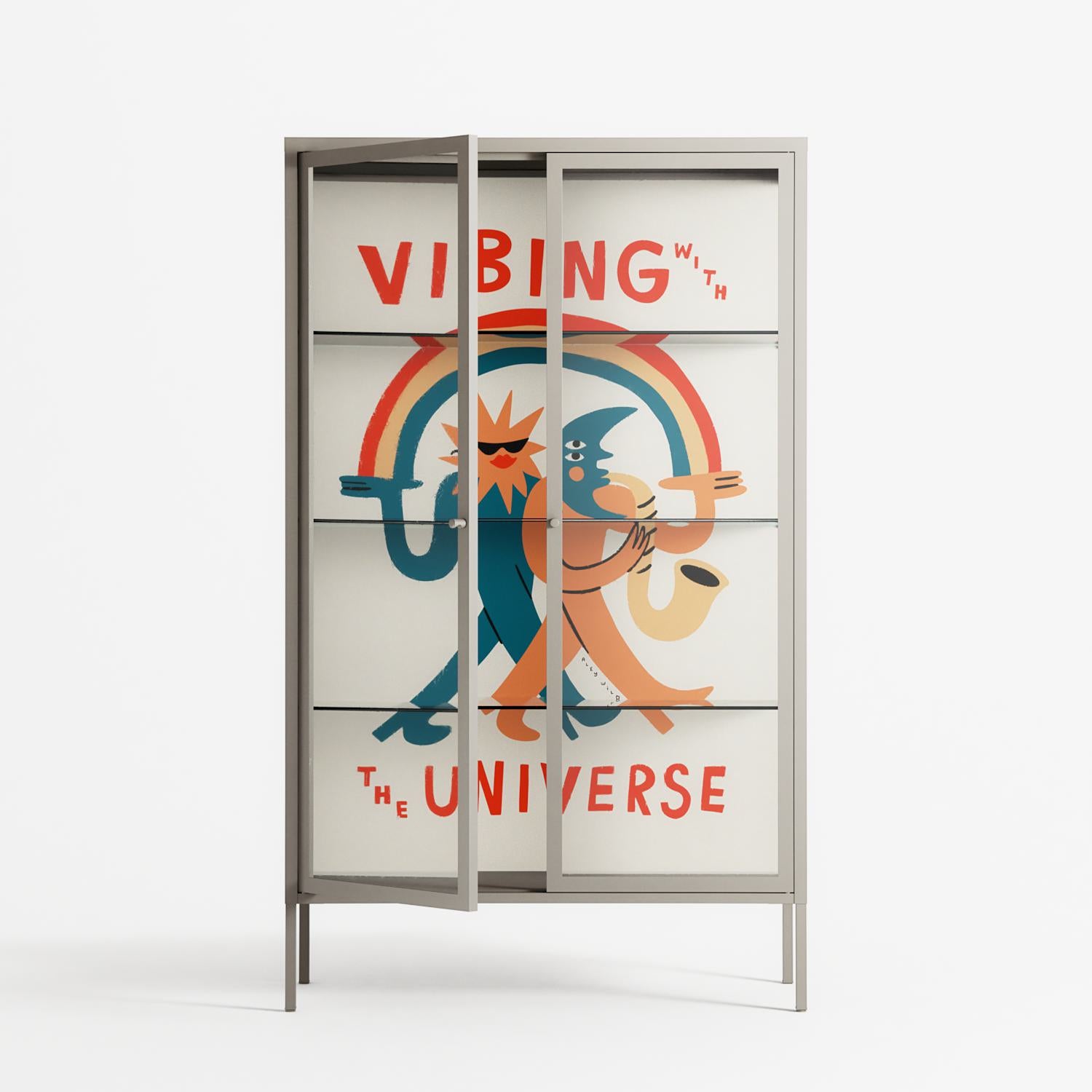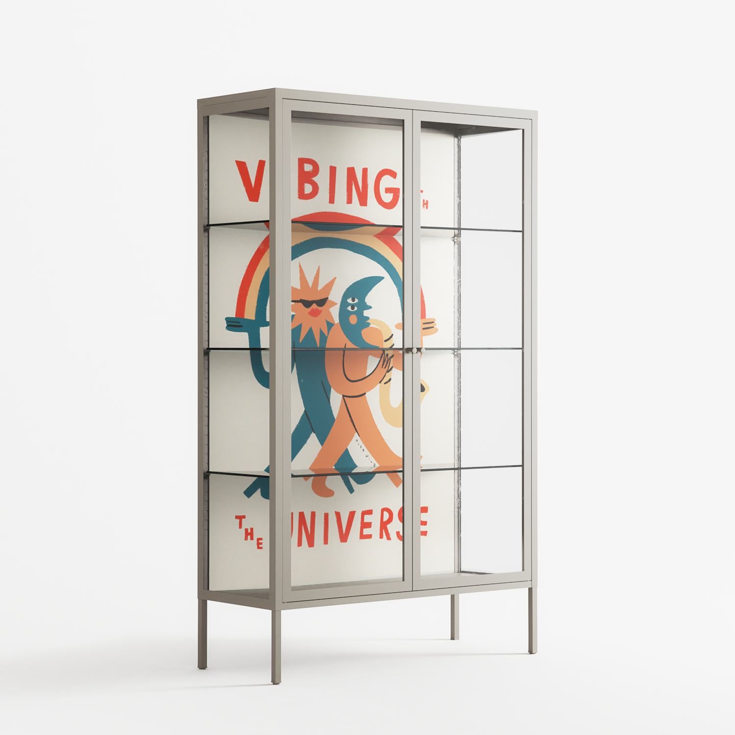 Vibing With The Universe by Aley Wild, displayed within the Vitrine Cabinet behind Clear glass. Finished in the colour Pebble, the cabinet becomes a frame for the artwork and the objects within.
