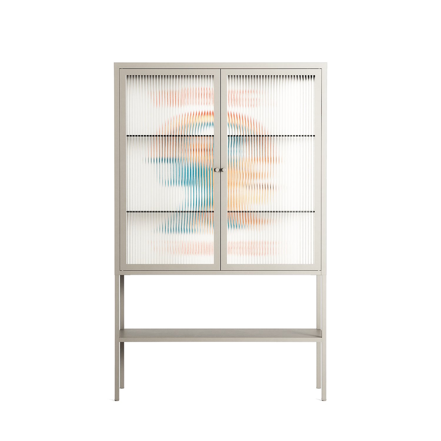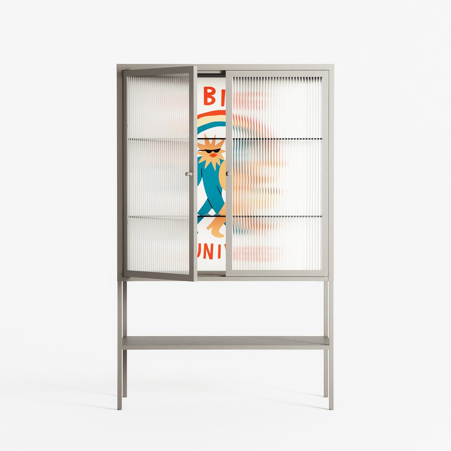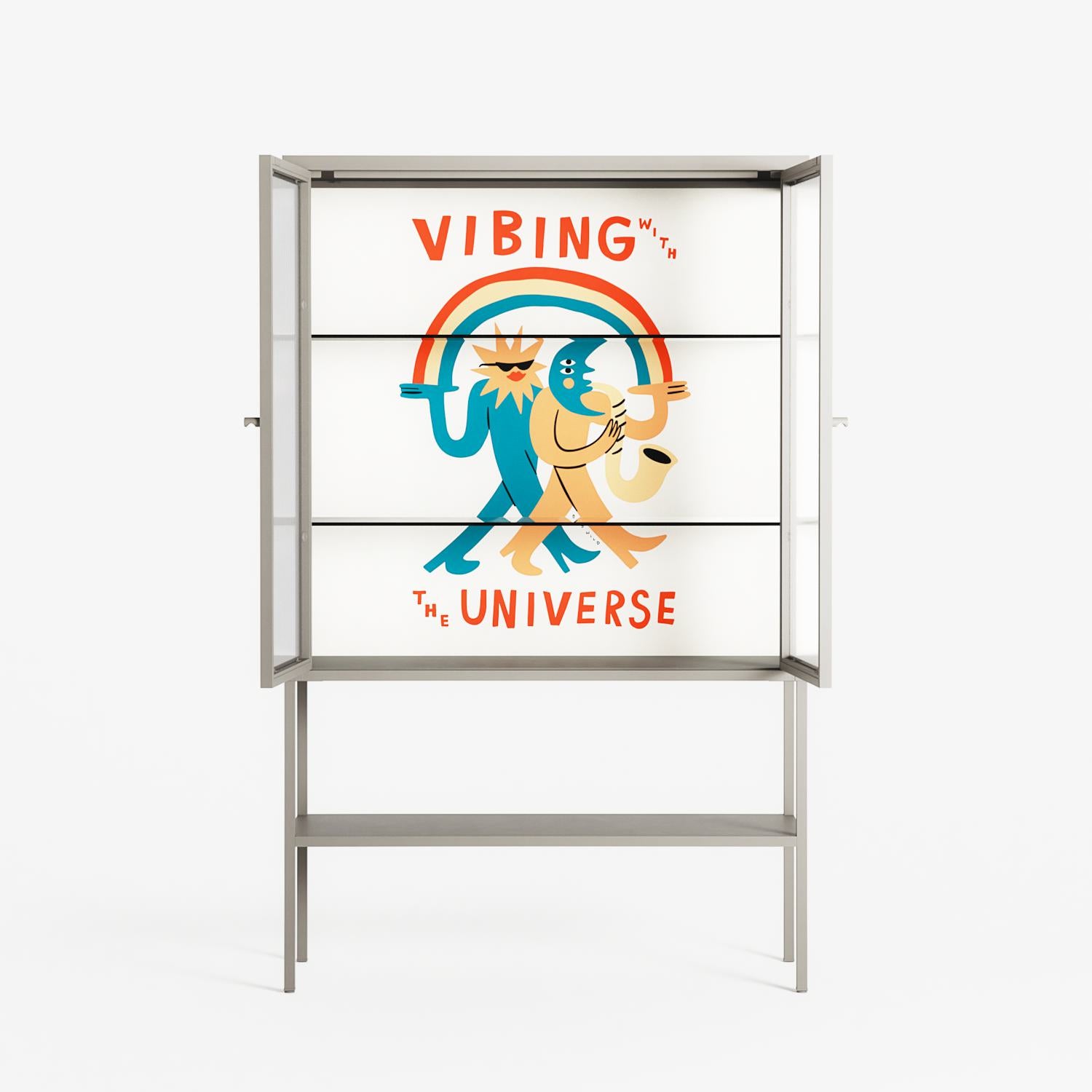 Vibing With The Universe by Aley Wild, displayed within the Vitrine Loft Cabinet behind Reeded glass. Finished in the colour Pebble, the cabinet becomes a frame for the artwork and the objects within.