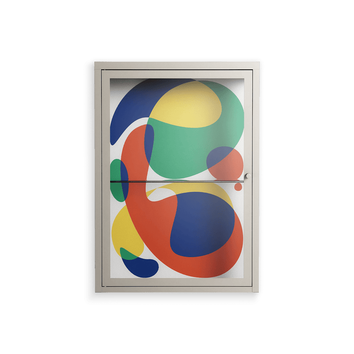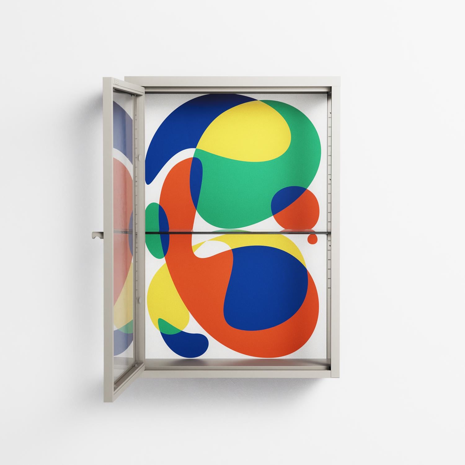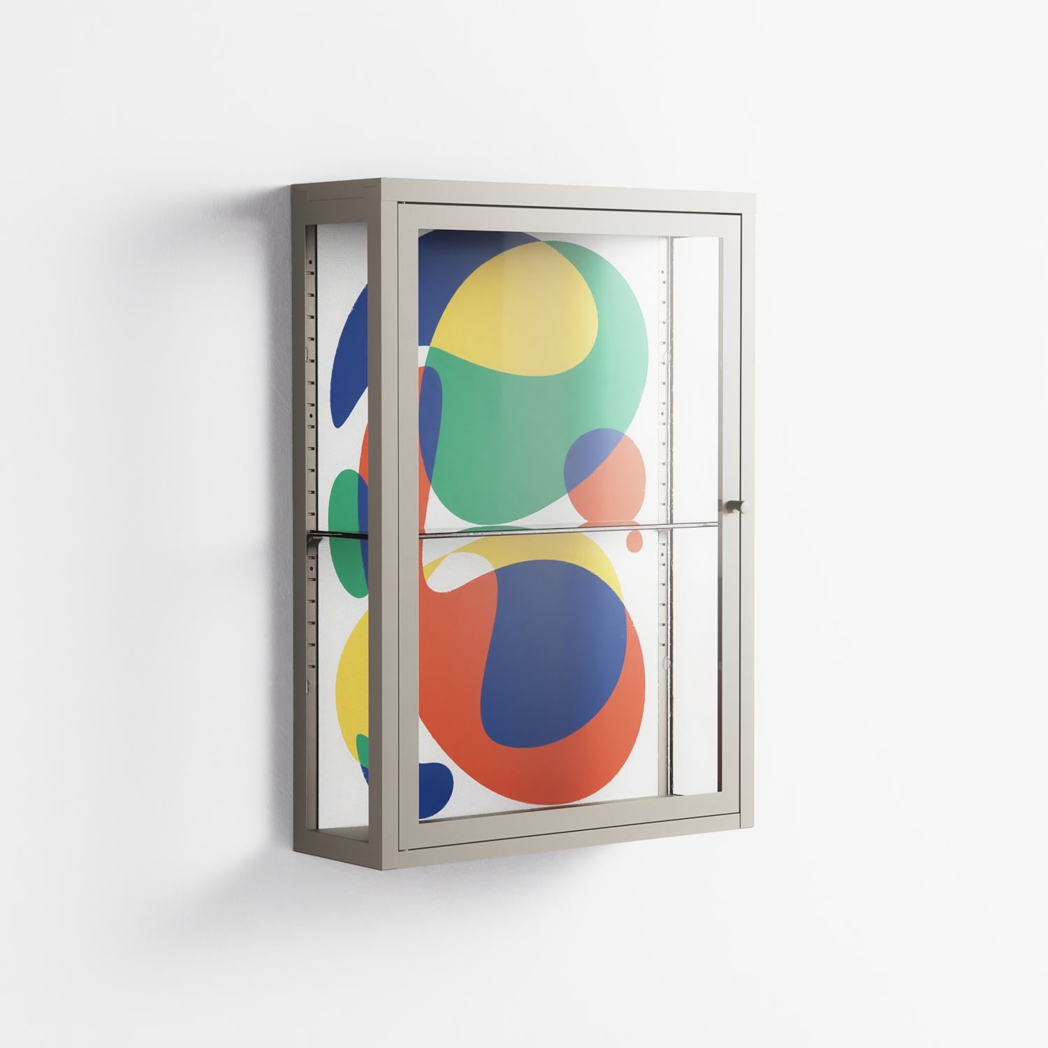Vibrante by Vratislav Pecka, displayed within the Vitrine Wall Cabinet behind Clear glass. Finished in the colour Pebble, the cabinet becomes a frame for the artwork and the objects within.