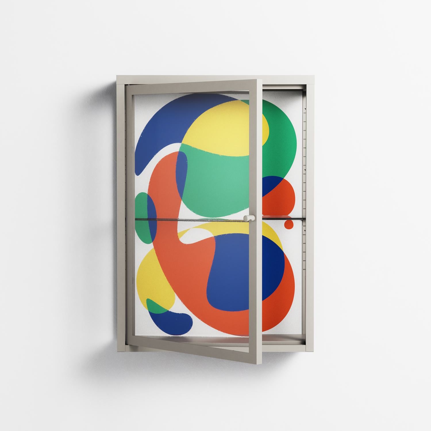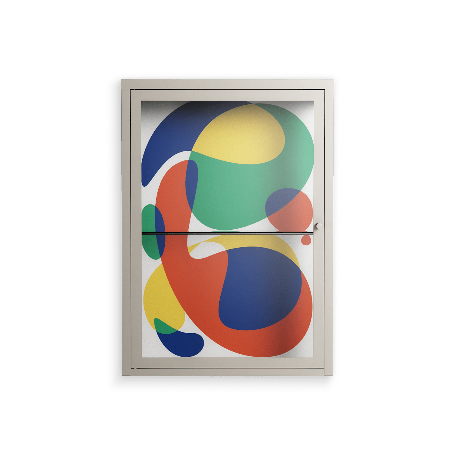 Vitrine pairs artworks by artists, designers, and creatives from around the world with a frame that elevates and displays them in everyday space. The cabinet is built from precision-cut metal with a powder-coated finish — resistant to wear and crafted for stability — making it ideal for both office and home spaces.
