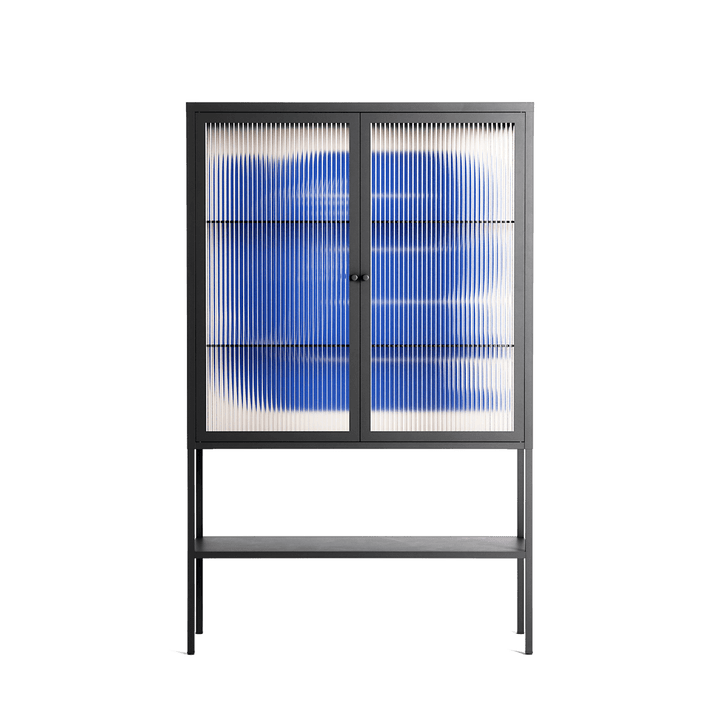 Wait 2 by Andrea Devia-Nuño, displayed within the Vitrine Loft Cabinet behind Reeded glass. Finished in the colour Antracite, the cabinet becomes a frame for the artwork and the objects within.