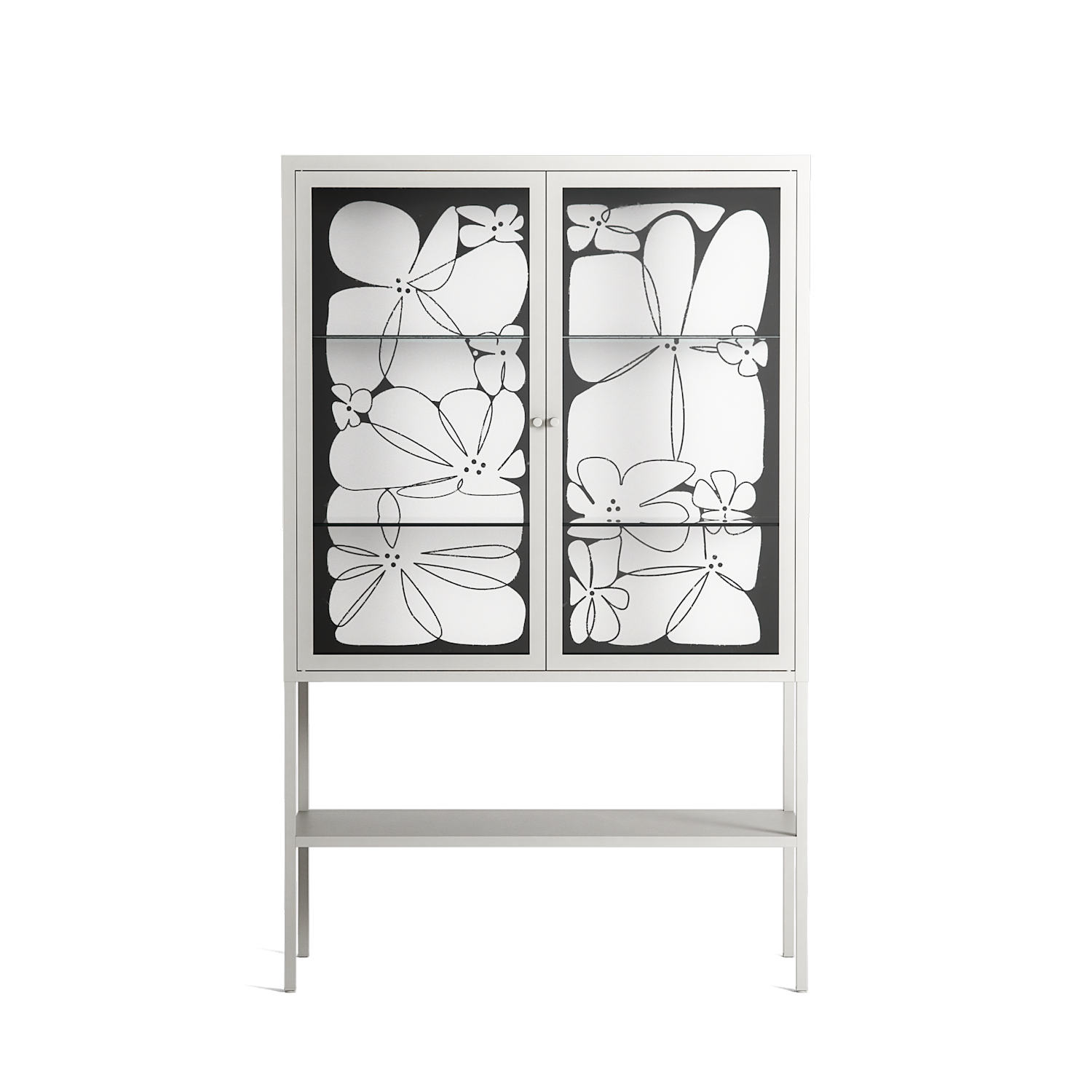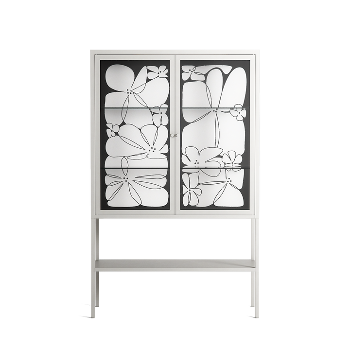 White Flowers by Konrad Blaszczyk, displayed within the Vitrine Loft Cabinet behind Clear glass. Finished in the colour Chalk, the cabinet becomes a frame for the artwork and the objects within.