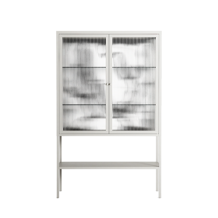 White Potted Plant by Konrad Blaszczyk, displayed within the Vitrine Loft Cabinet behind Reeded glass. Finished in the colour Chalk, the cabinet becomes a frame for the artwork and the objects within.