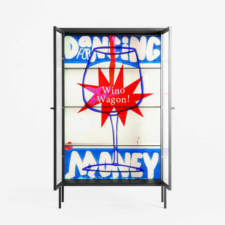 Wino Wagon by Ciara Wade, displayed within the Vitrine Cabinet behind Reeded glass. Finished in the colour Antracite, the cabinet becomes a frame for the artwork and the objects within.