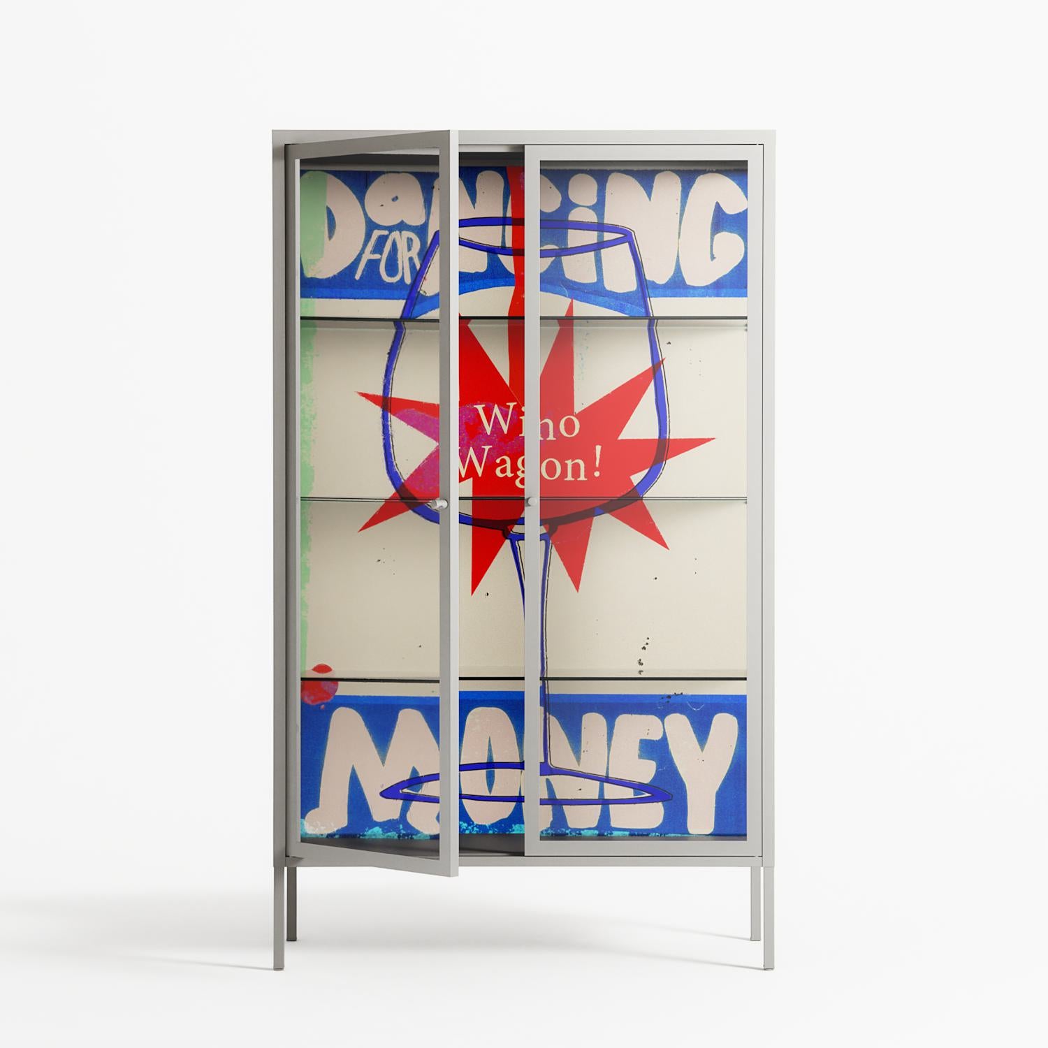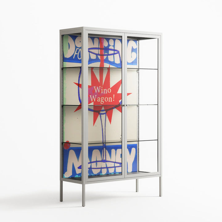 Wino Wagon by Ciara Wade, displayed within the Vitrine Cabinet behind Clear glass. Finished in the colour Chalk, the cabinet becomes a frame for the artwork and the objects within.