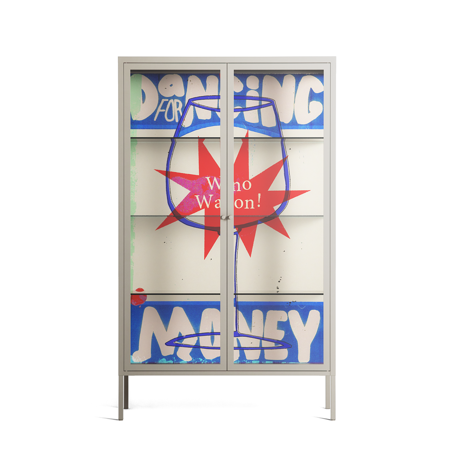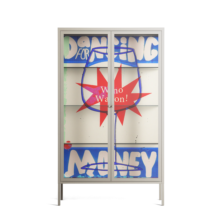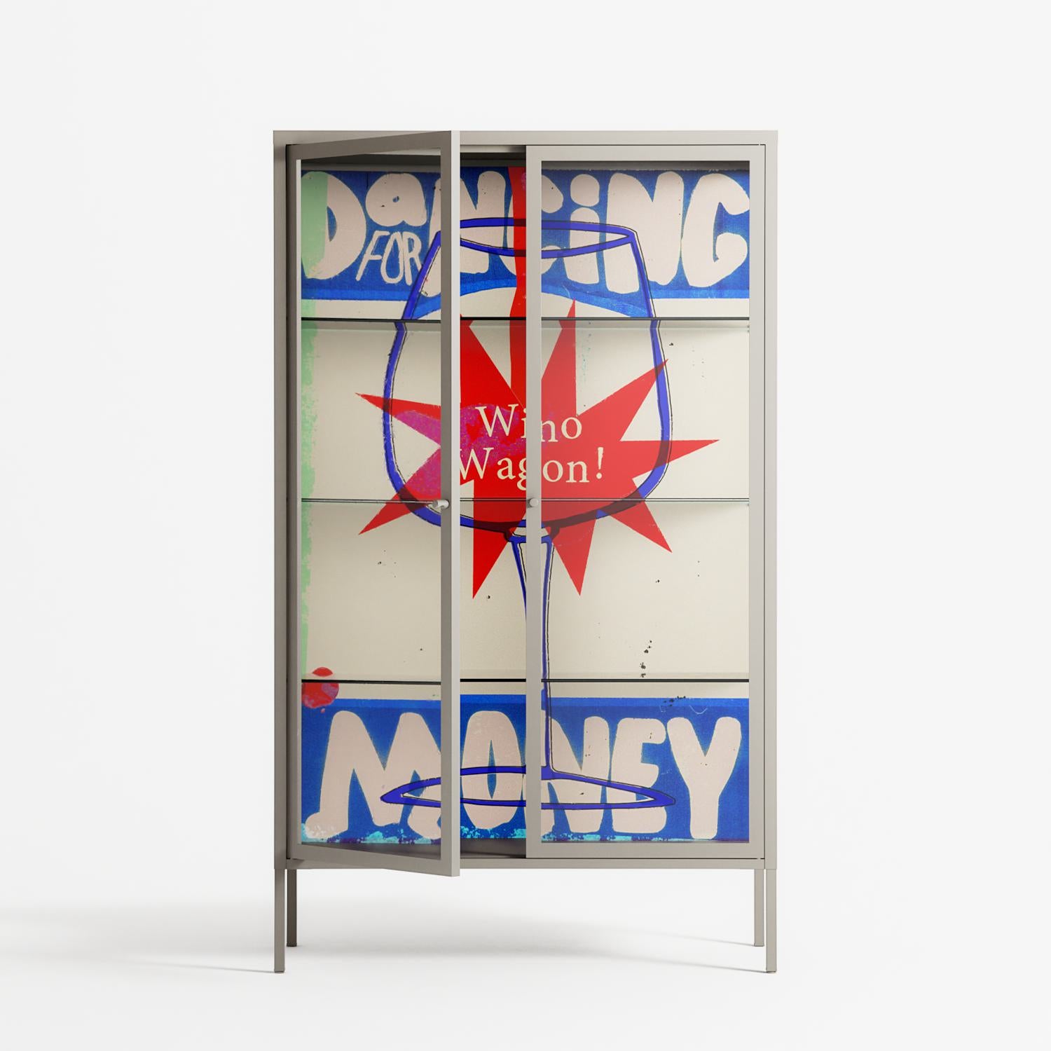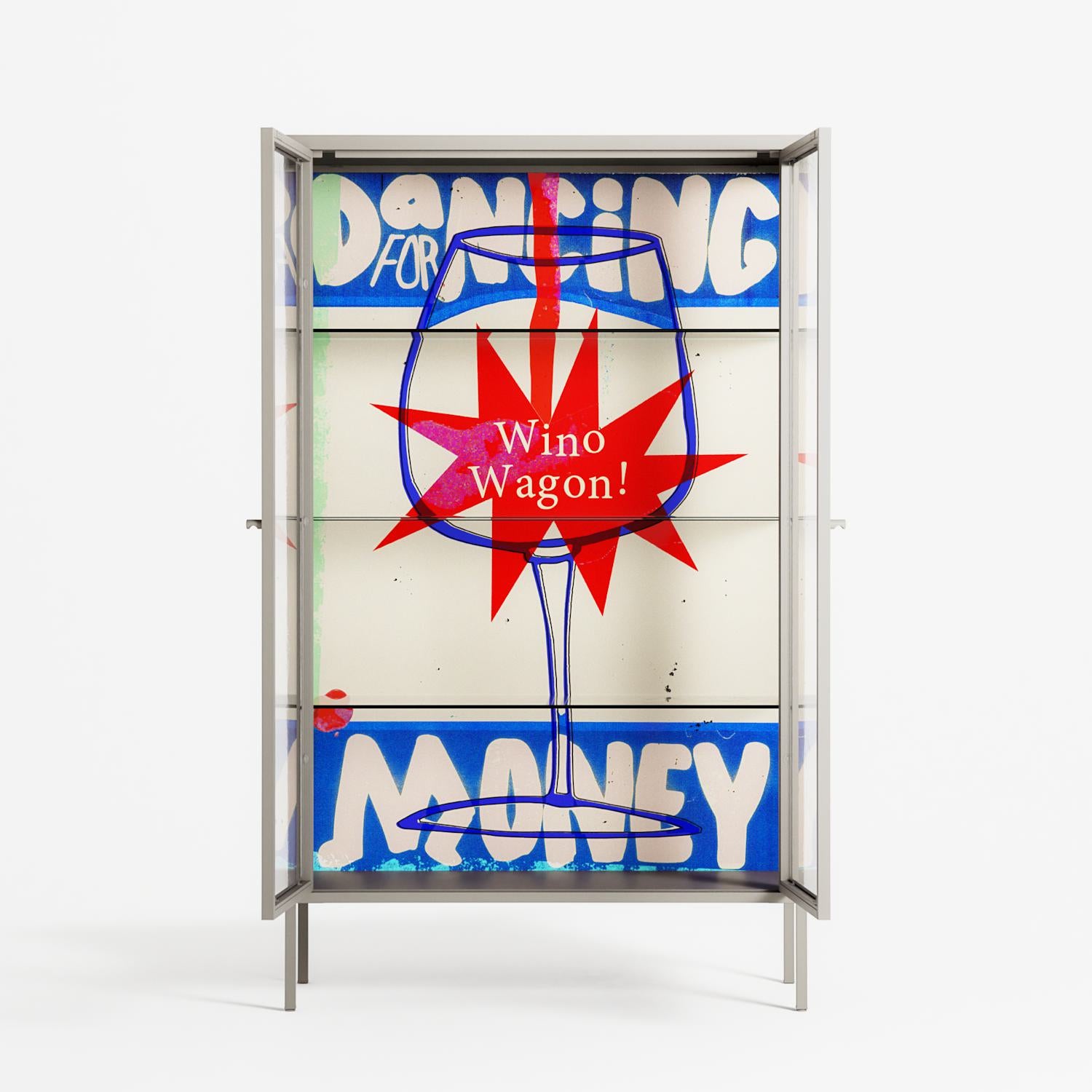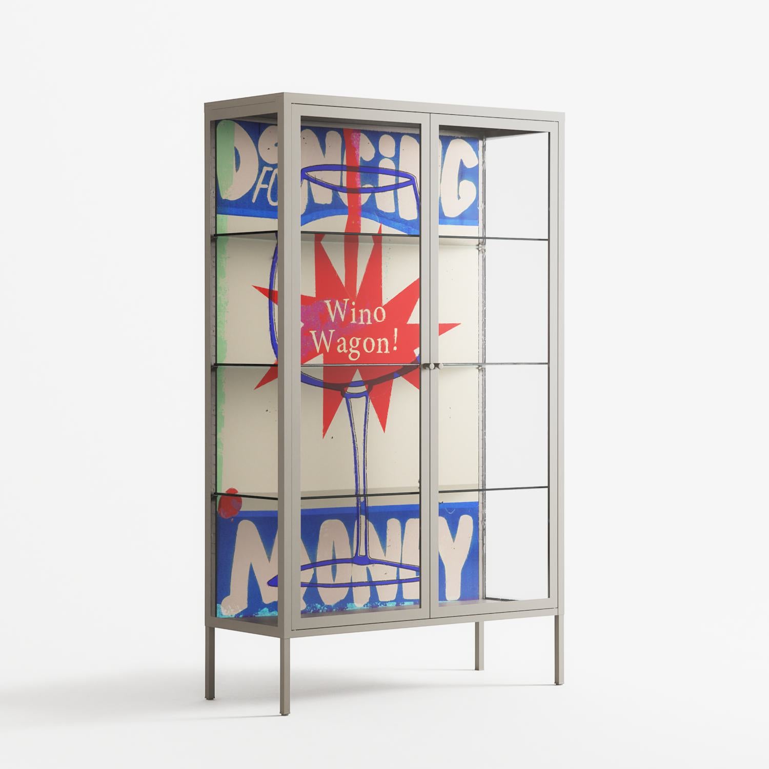 Wino Wagon by Ciara Wade, displayed within the Vitrine Cabinet behind Clear glass. Finished in the colour Pebble, the cabinet becomes a frame for the artwork and the objects within.