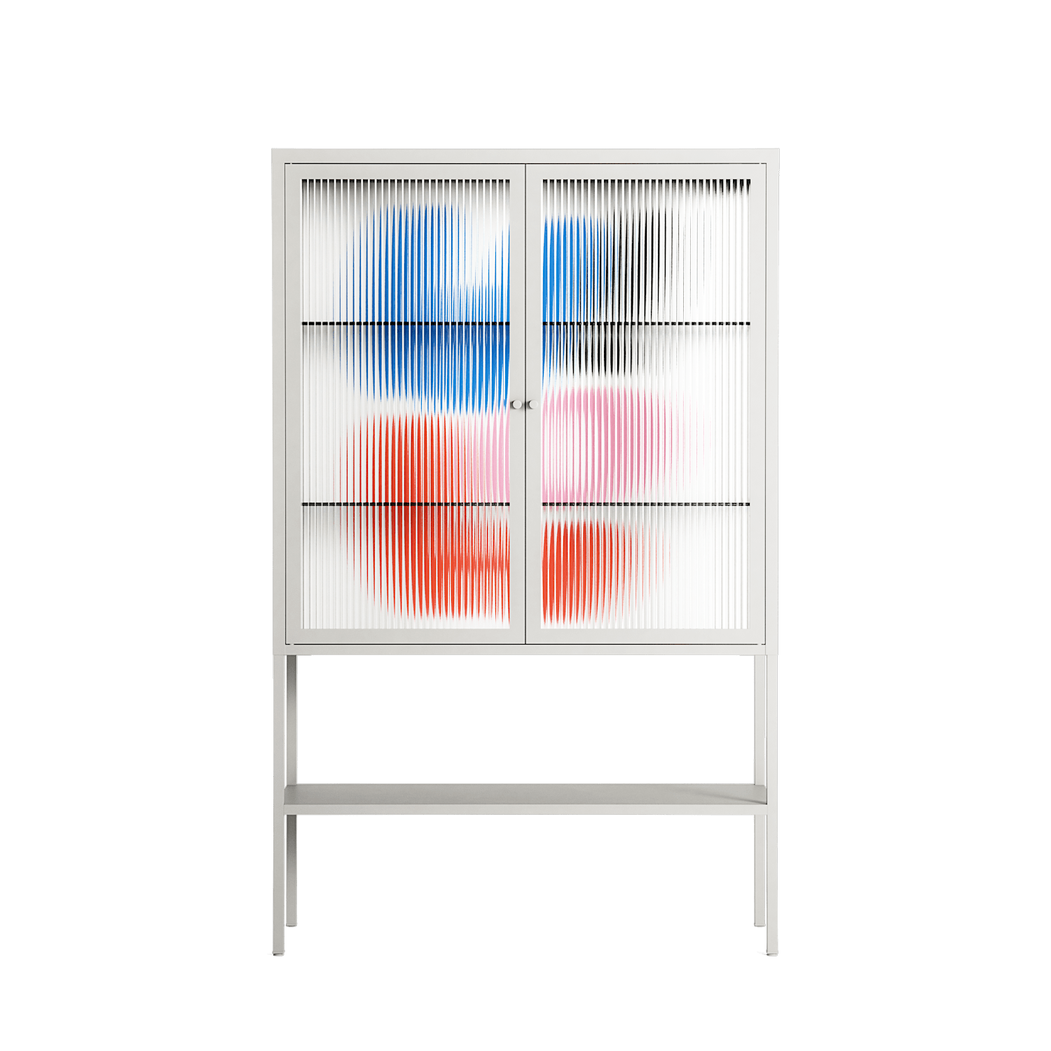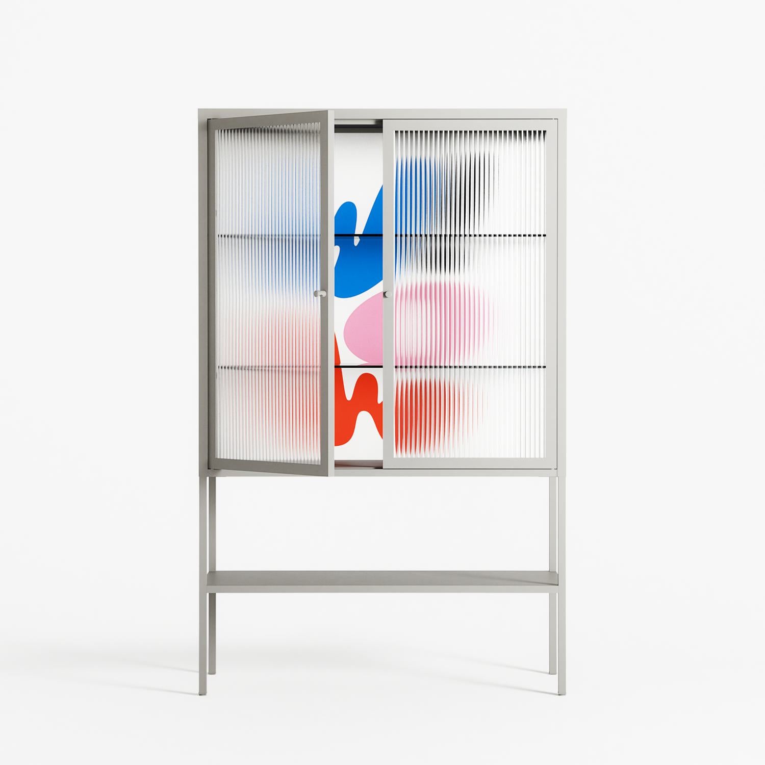 Wow by Vratislav Pecka, displayed within the Vitrine Loft Cabinet behind Reeded glass. Finished in the colour Chalk, the cabinet becomes a frame for the artwork and the objects within.