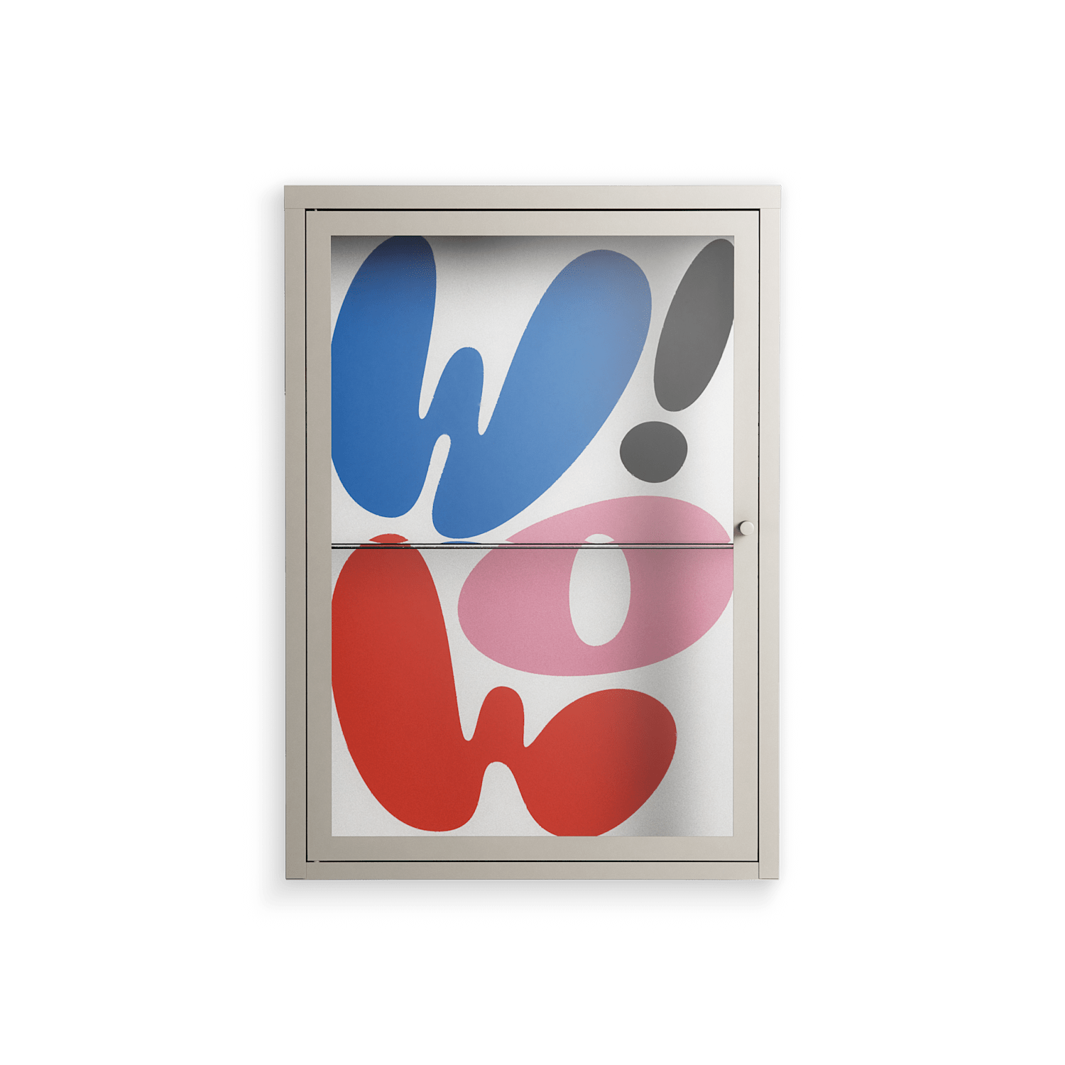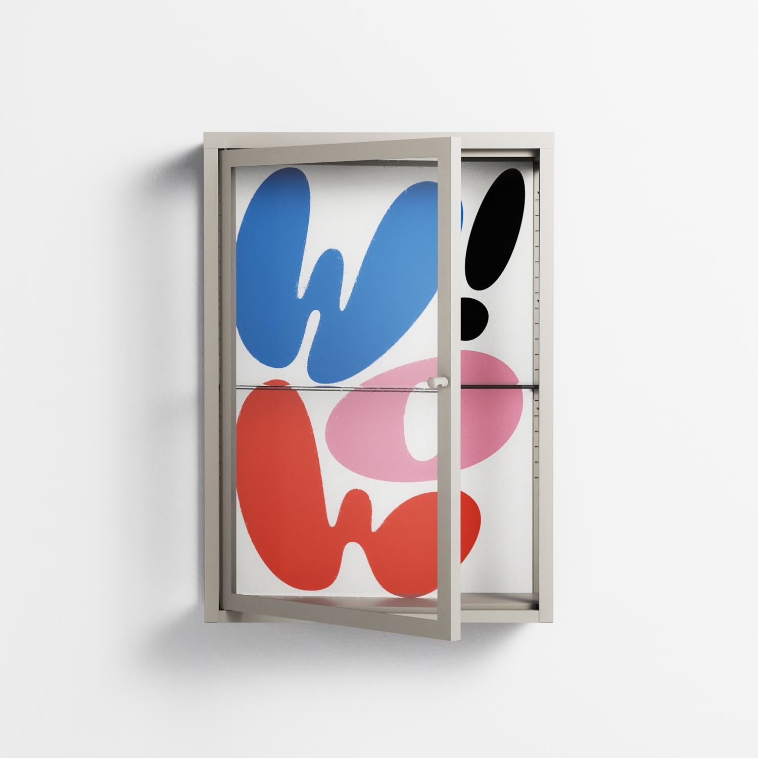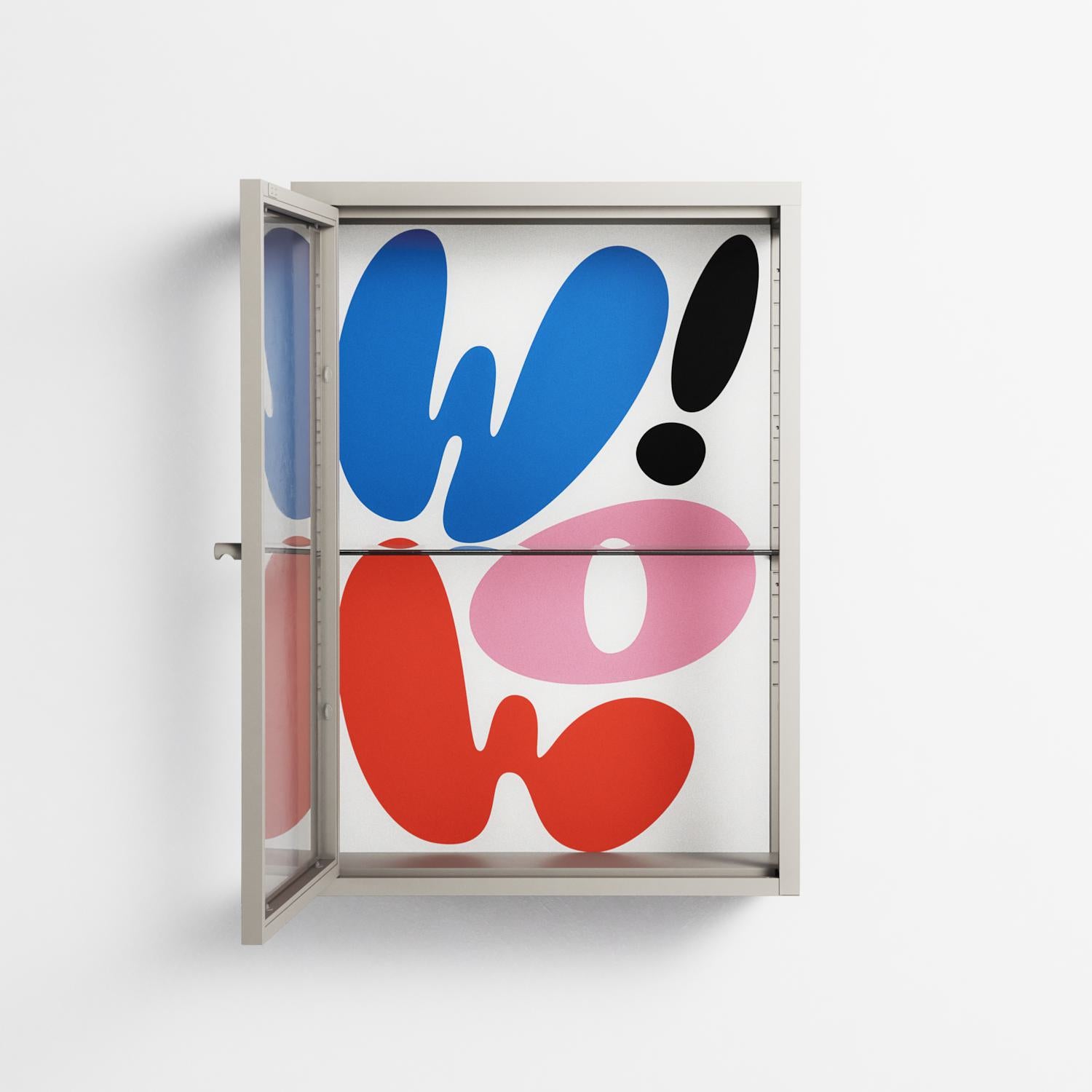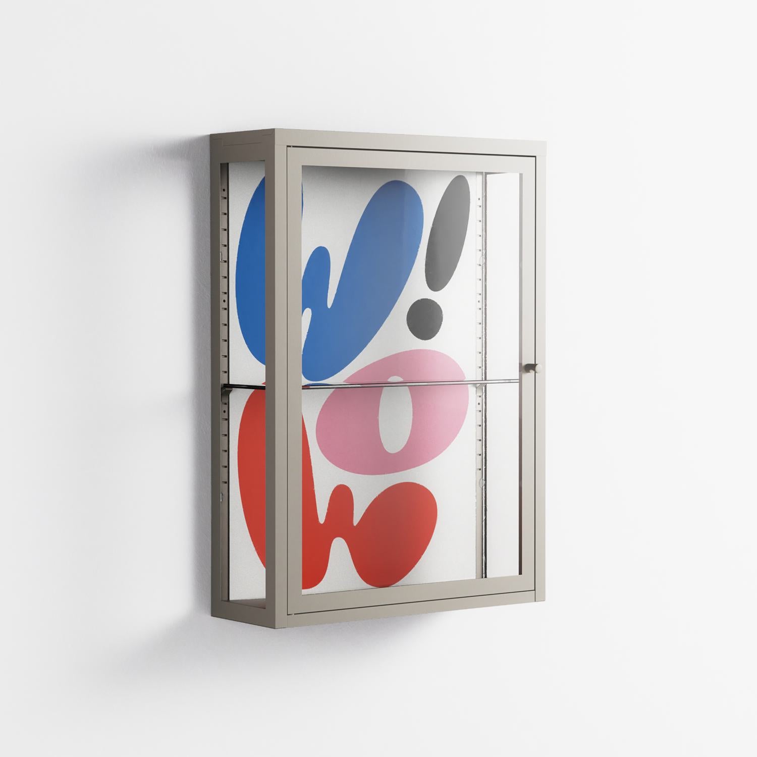 Wow by Vratislav Pecka, displayed within the Vitrine Wall Cabinet behind Clear glass. Finished in the colour Pebble, the cabinet becomes a frame for the artwork and the objects within.