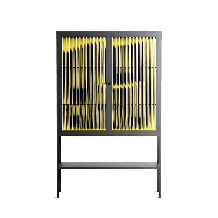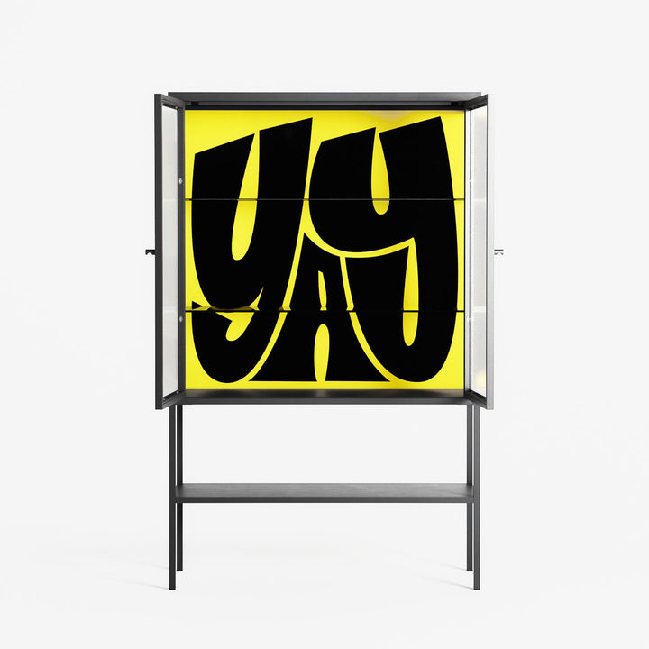 Yay by Vratislav Pecka, displayed within the Vitrine Loft Cabinet behind Reeded glass. Finished in the colour Antracite, the cabinet becomes a frame for the artwork and the objects within.
