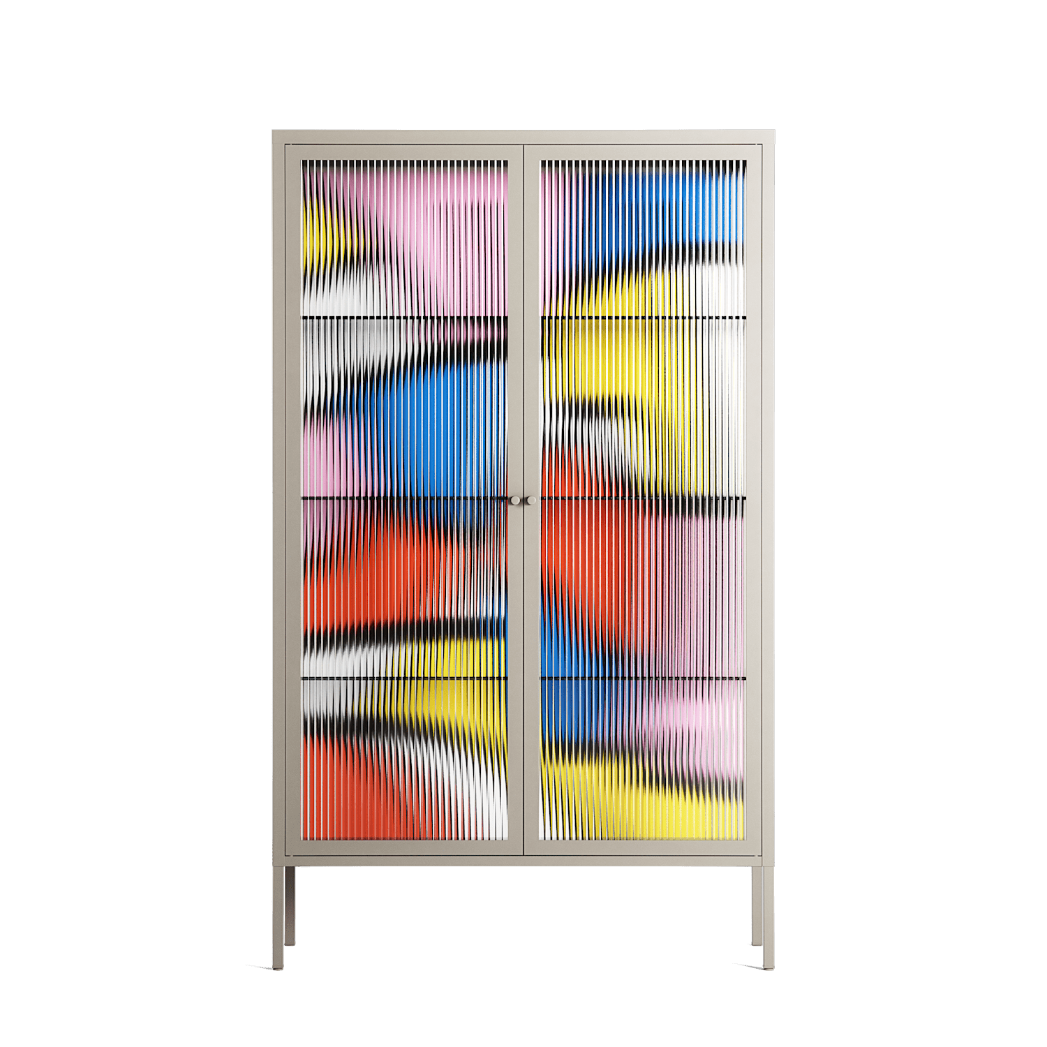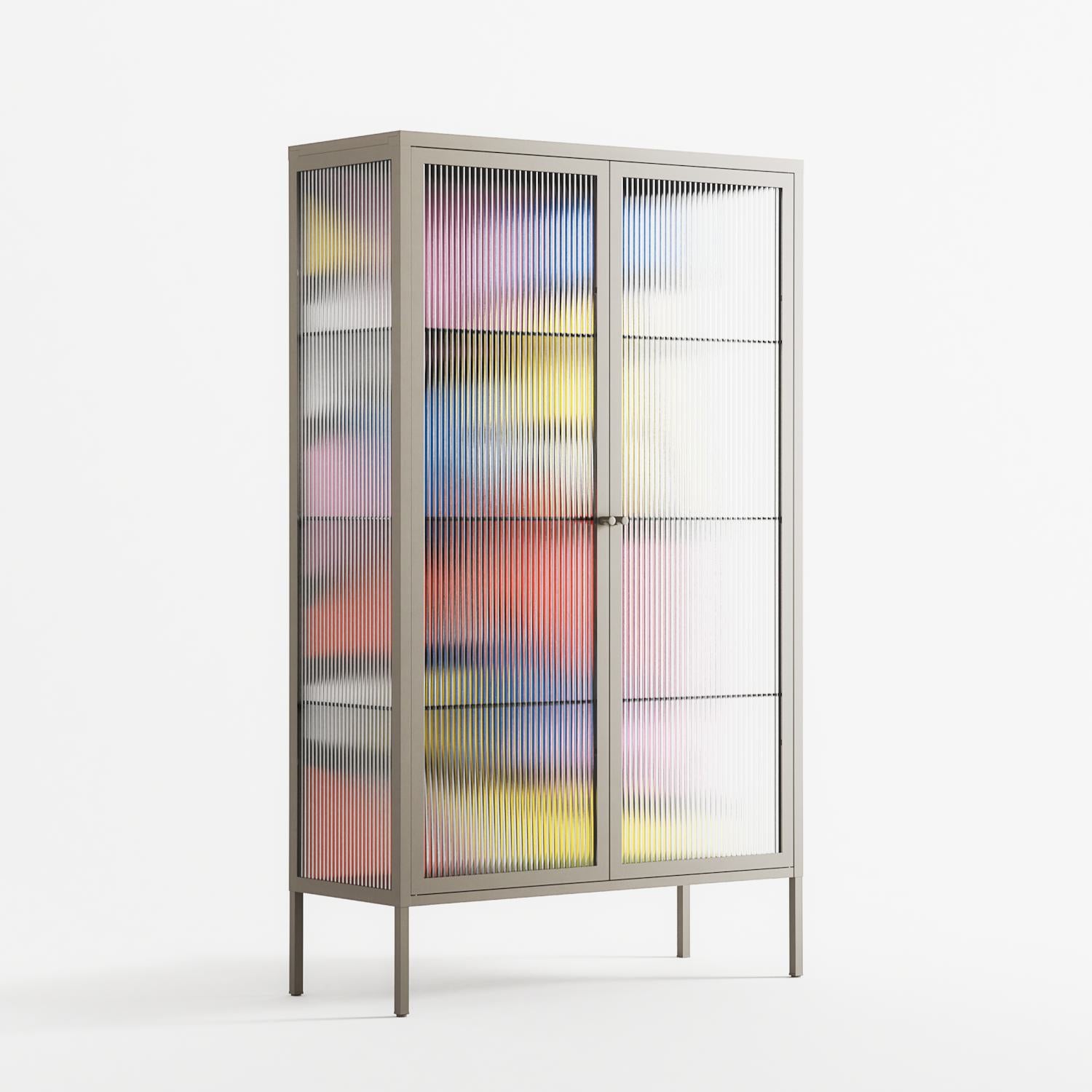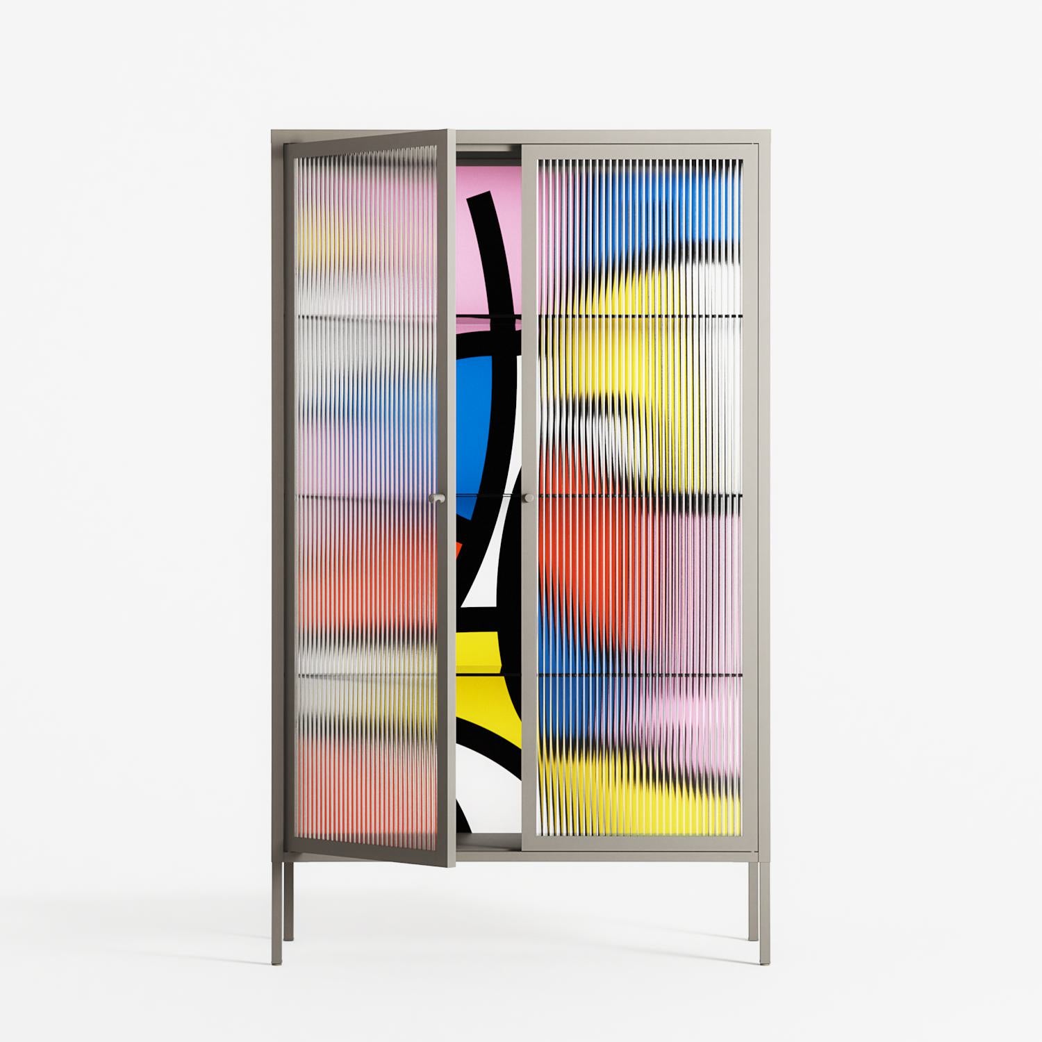 Yo by Vratislav Pecka, displayed within the Vitrine Cabinet behind Reeded glass. Finished in the colour Pebble, the cabinet becomes a frame for the artwork and the objects within.